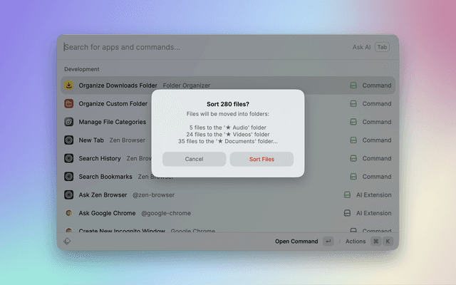 Automatically organize your files into categorized folders with this powerful Raycast extension. Keep your Downloads folder clean and organize any custom folder effortlessly.