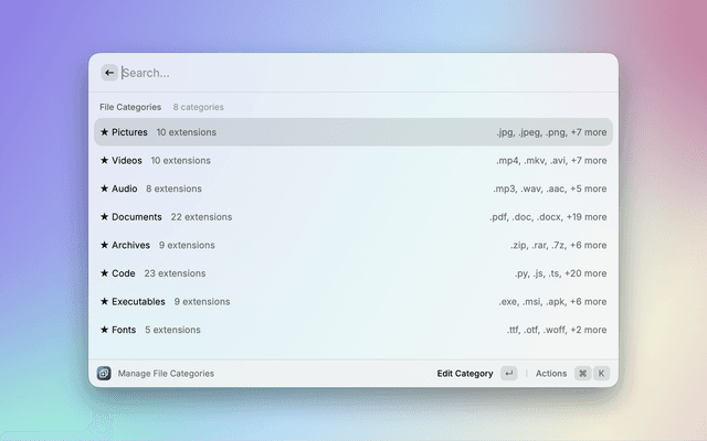 Customize file organization categories to match your workflow. Add, remove, or modify file type mappings for each category.