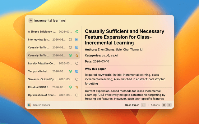 | Recent Papers | Browse recently added papers (count-based). Same detail and actions as Today Papers. Limit is set in Preferences (Recent Papers Limit). |