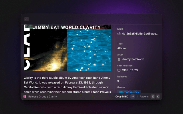 Search MusicBrainz for artists, releases, recordings, release groups, labels, and works. View detailed information including discographies, tracklists, cover art, and Wikipedia summaries. Quickly copy MBIDs and other identifiers. Lookup an entity by pasting a MusicBrainz URL or MBID.