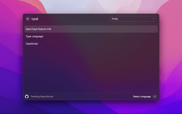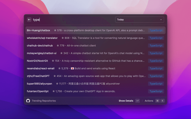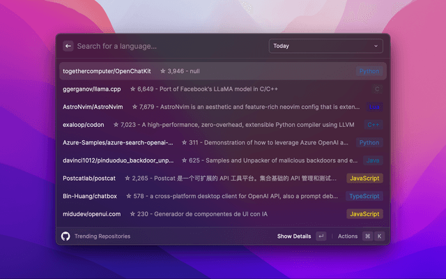 This is a Raycast extension that displays the top trending repositories on GitHub. You can filter by language and time period (today, this week, this month).