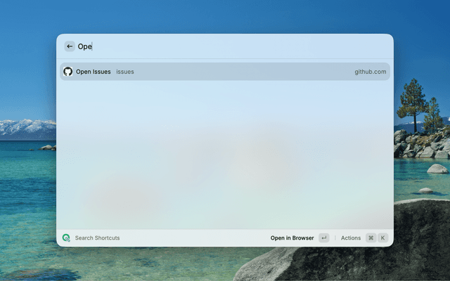 Browse and search all your shortcuts with Raycast's fuzzy filtering. Results are cached locally for 5 minutes so repeated searches are instant.