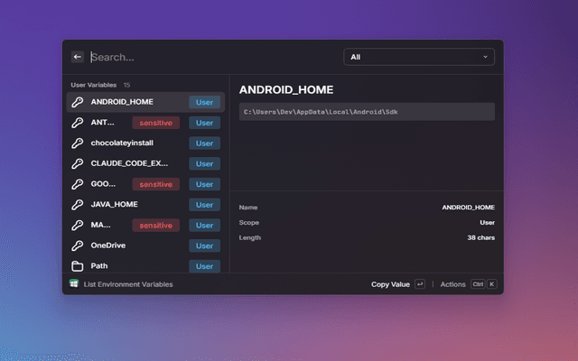 A keyboard-first alternative to the Windows Environment Variables dialog. Browse, search, edit, create, and delete Windows environment variables and PATH entries directly from Raycast.