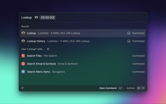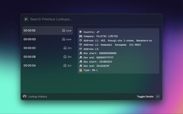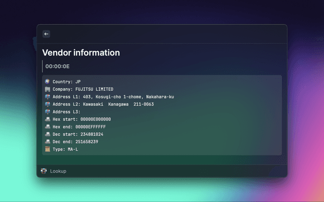 A simple extension that uses https://www.macvendorlookup.com to lookup vendor information about a given a MAC address, OUI or IAB.