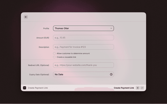 Generate payment links instantly. Set custom amounts, descriptions, and expiry dates. Links are automatically copied to your clipboard.