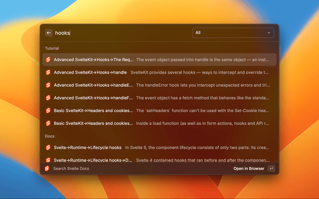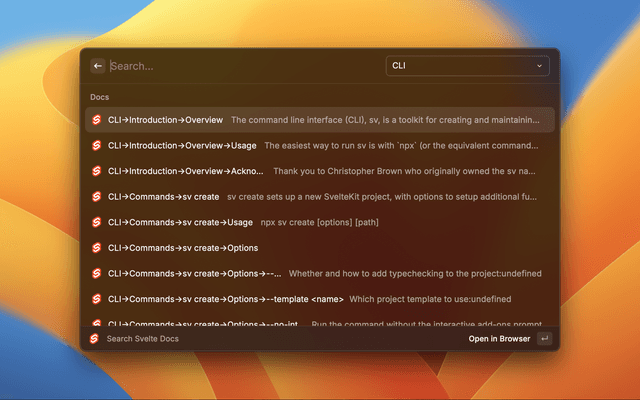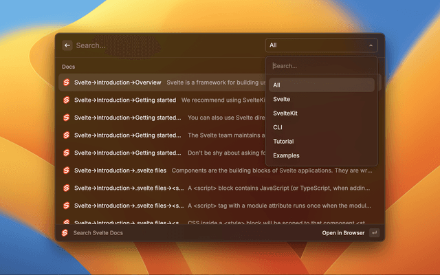 Search the svelte docs directly in RayCast