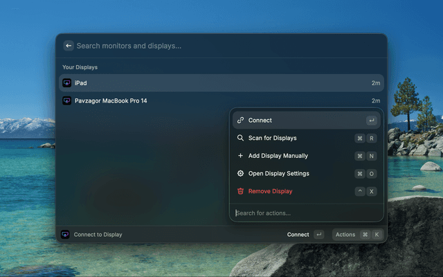 Raycast extension to quickly connect to AirPlay/Sidecar displays while seamlessly preserving your audio output. No more audio switching to your iPad or Mac display!
