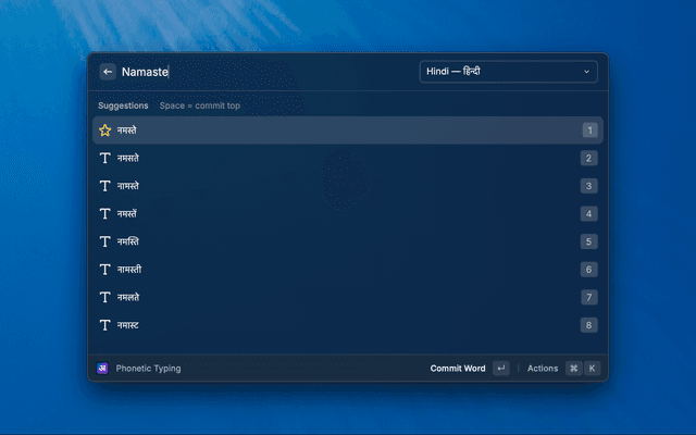 • Live suggestions — see up to 8 transliteration candidates as you type, ranked by relevance.