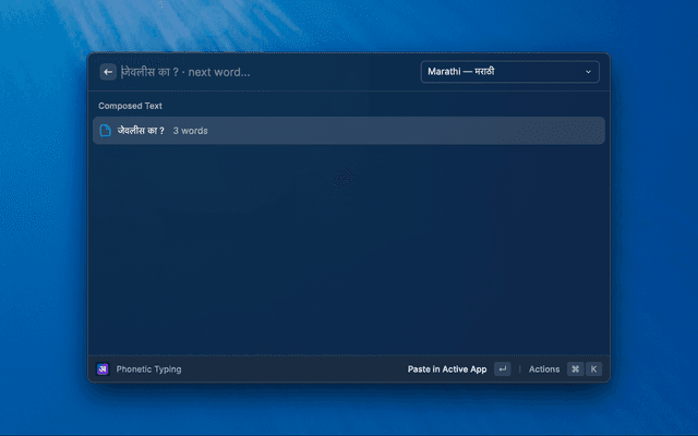• Paste or copy — press Enter to paste the composed text directly into your active app, or Cmd+Shift+C to copy it to the clipboard.