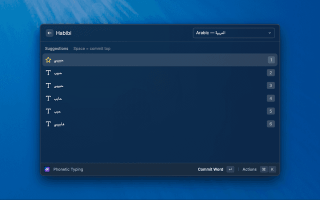 4. Press Space to commit the top suggestion, or use arrow keys and Enter to pick an alternative.