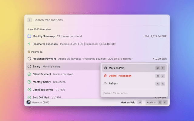 Easily add and manage financial transactions in your Rewiser account — directly from Raycast.