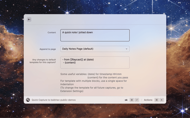 - Manage Capture Templates to create reusable presets for different capture workflows (daily notes, TODOs, meeting notes, etc.). Designate one as your Instant Capture template.
