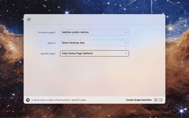 - Create Graph Quicklink to build Raycast quicklinks that open Roam graphs or specific pages