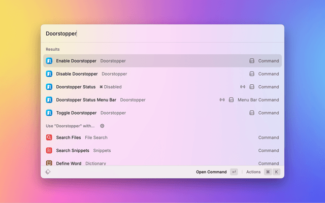 Once installed, simply trigger the Raycast command palette and search for the Doorstopper commands.