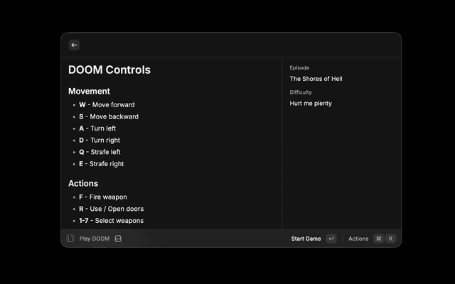 Cmd+Shift+Q - Stop Game (cleanly exits and releases memory)Cmd+Shift+R - Redownload WAD File (delete and re-download on next launch)Note: The ESC key opens DOOM's in-game pause menu (standard DOOM behavior). To fully stop the game and release WASM resources, use