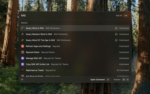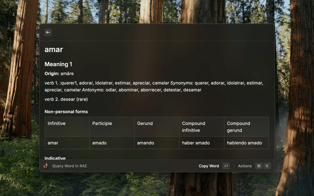 Search words in the Royal Spanish Academy dictionary directly from Raycast. Get definitions, conjugations, and expressions quickly without opening a browser. This extension uses the unofficial API rae-api.com.