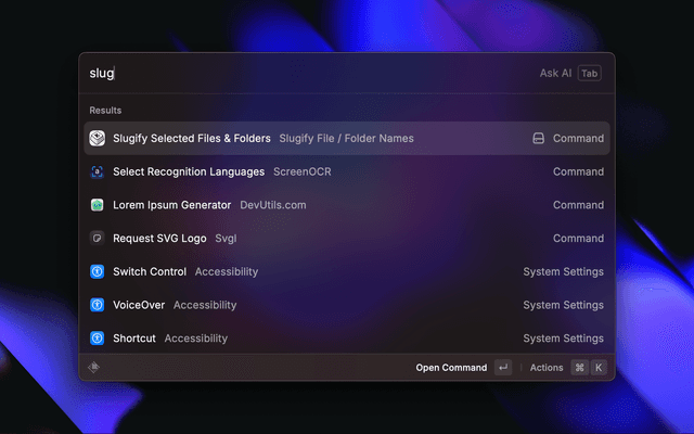 - Run Command: Open Raycast and type "Slugify Selected Files & Folders" or use the configured shortcut