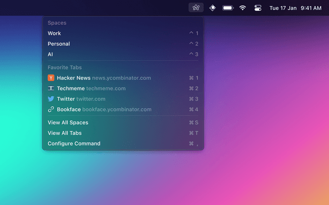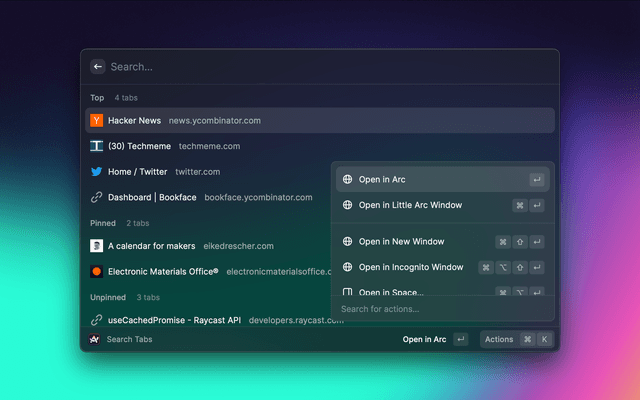 Search and quickly navigate your Arc browser's history and open tabs. You can open recent tabs in Arc or Little Arc as well as copy websites to quickly share them.