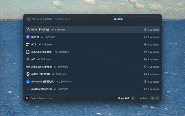 Search, preview, and copy 4,000+ brand SVG icons from thesvg.org directly in Raycast.