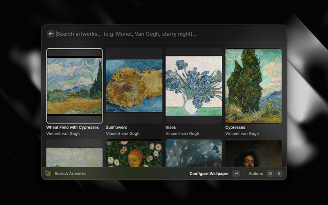 The extension fetches artwork images from the Met Museum's public API, converts them to ASCII characters using brightness mapping, and renders the result as a full-screen wallpaper image using macOS native text rendering (via sips and a compiled Swift renderer).