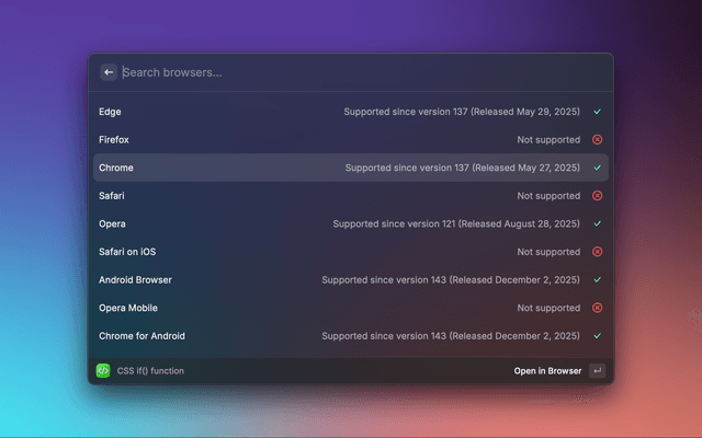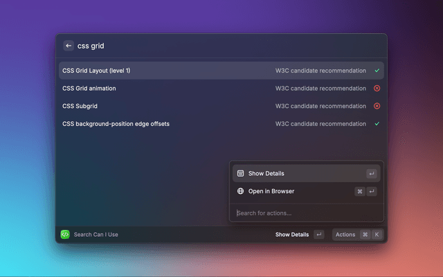 It's possible to configure this extension so that it reads the Browserlist configuration on web projects and show you the technologies supported (or not) directly from the main view. To do so, add the path to your project in the preferences in "Project path" (e.g ~/my-project)