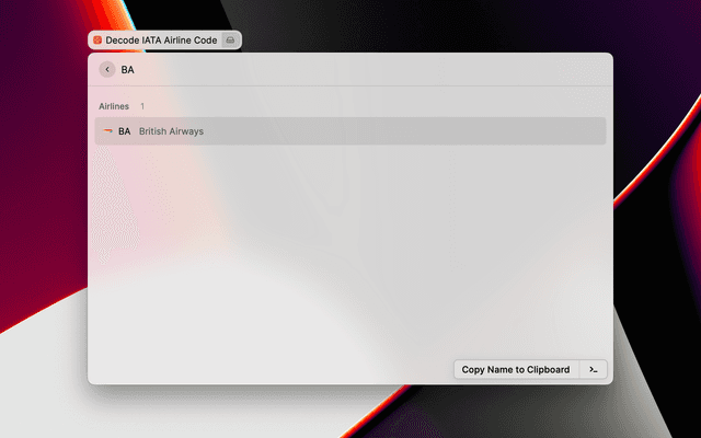 This Raycast extension decodes IATA codes for airports, airlines and aircraft, allowing you to work out what a given code refers to. To do this, it uses a bespoke API.