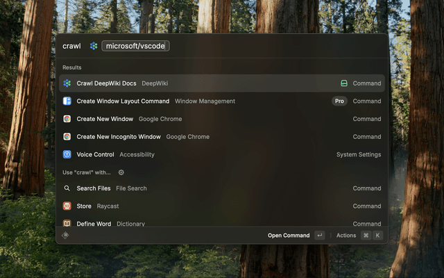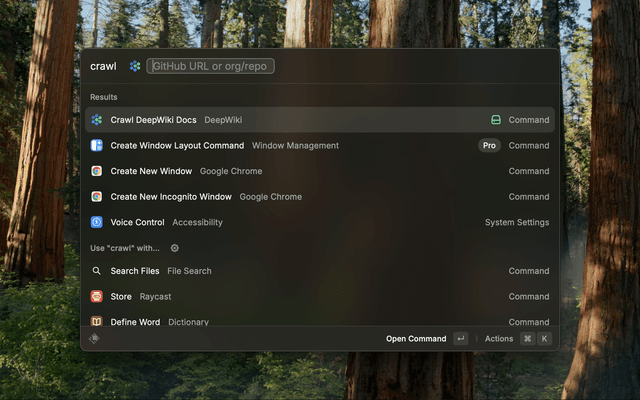 • Usage: Activate Raycast, type Crawl DeepWiki Docs, optionally enter a repository identifier, and press Enter. Alternatively, use the Cmd+Shift+K shortcut on a result in the "Search DeepWiki Repos" command.