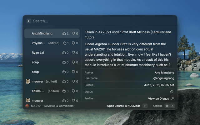 - Description: e.g., "Personal use for viewing NUSMods reviews"