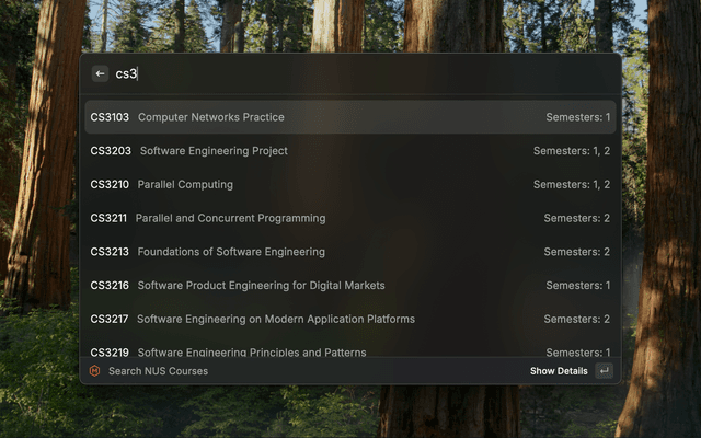 A Raycast extension to search and explore National University of Singapore (NUS) courses powered by NUSMods API.