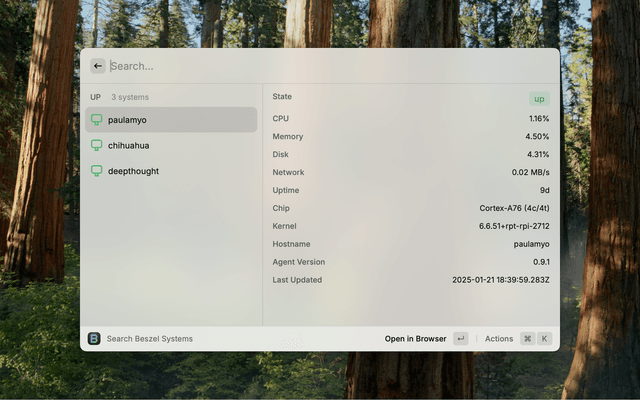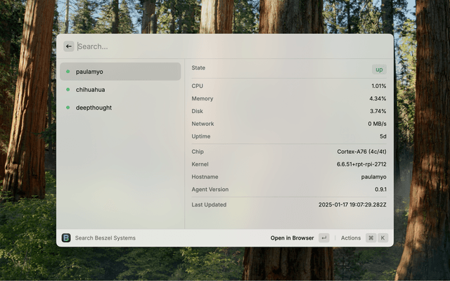 • Search Beszel Systems: Search for and display system statuses for each system monitored by Beszel