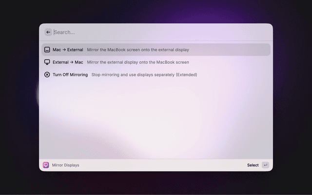 Toggles mirroring of external displays quickly.